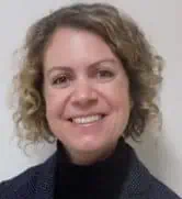 A professional woman with dark hair and earrings, smiling in an office setting.